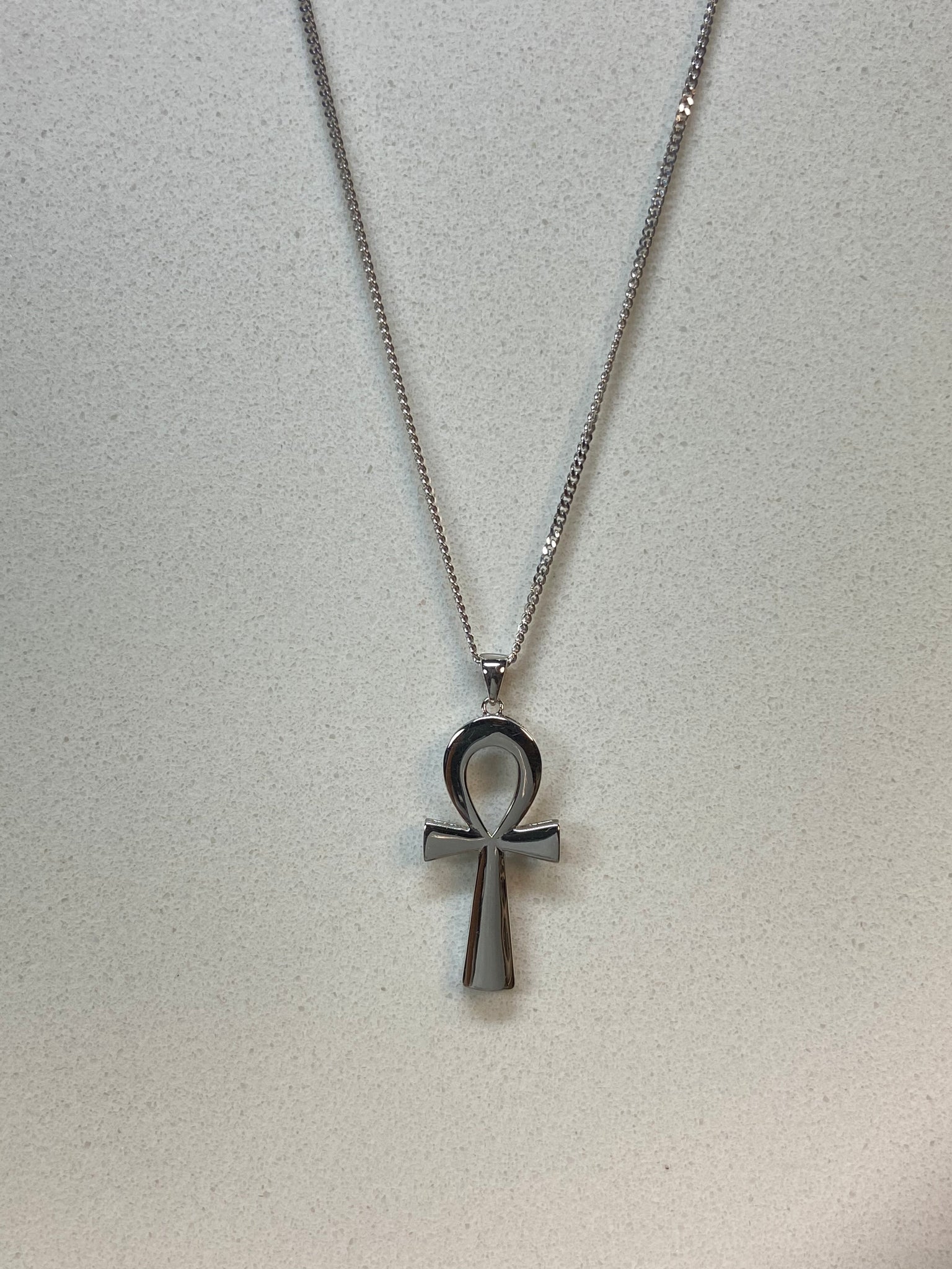 Polished Sterling silver Ankh pendant. The accompanying chain is sterling silver and rhodium plated to prevent the chain from ever tarnishing!