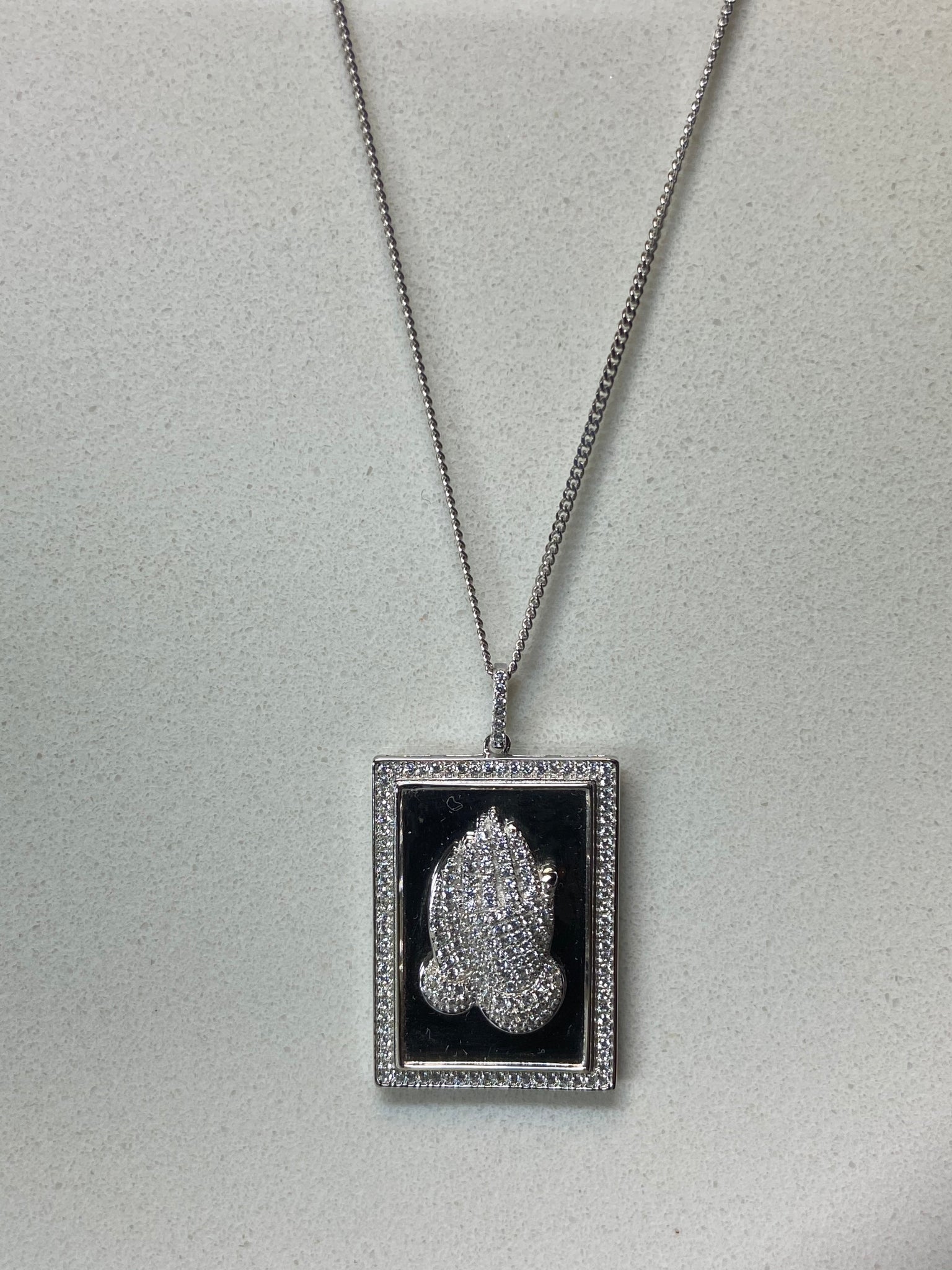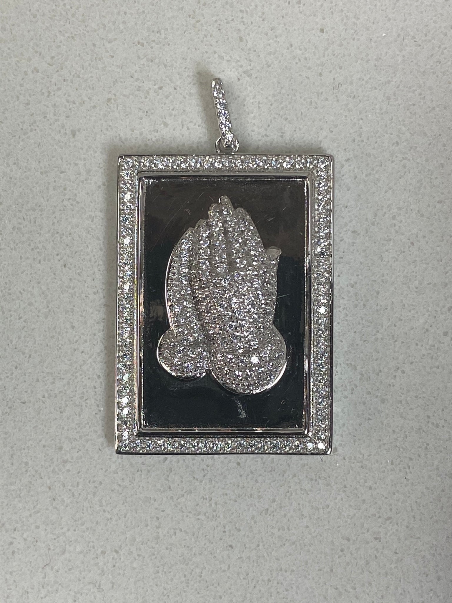 These praying hands are filled in with cubic zirconia stones on a rectangular sterling silver background to show off the sparkle of the hands.